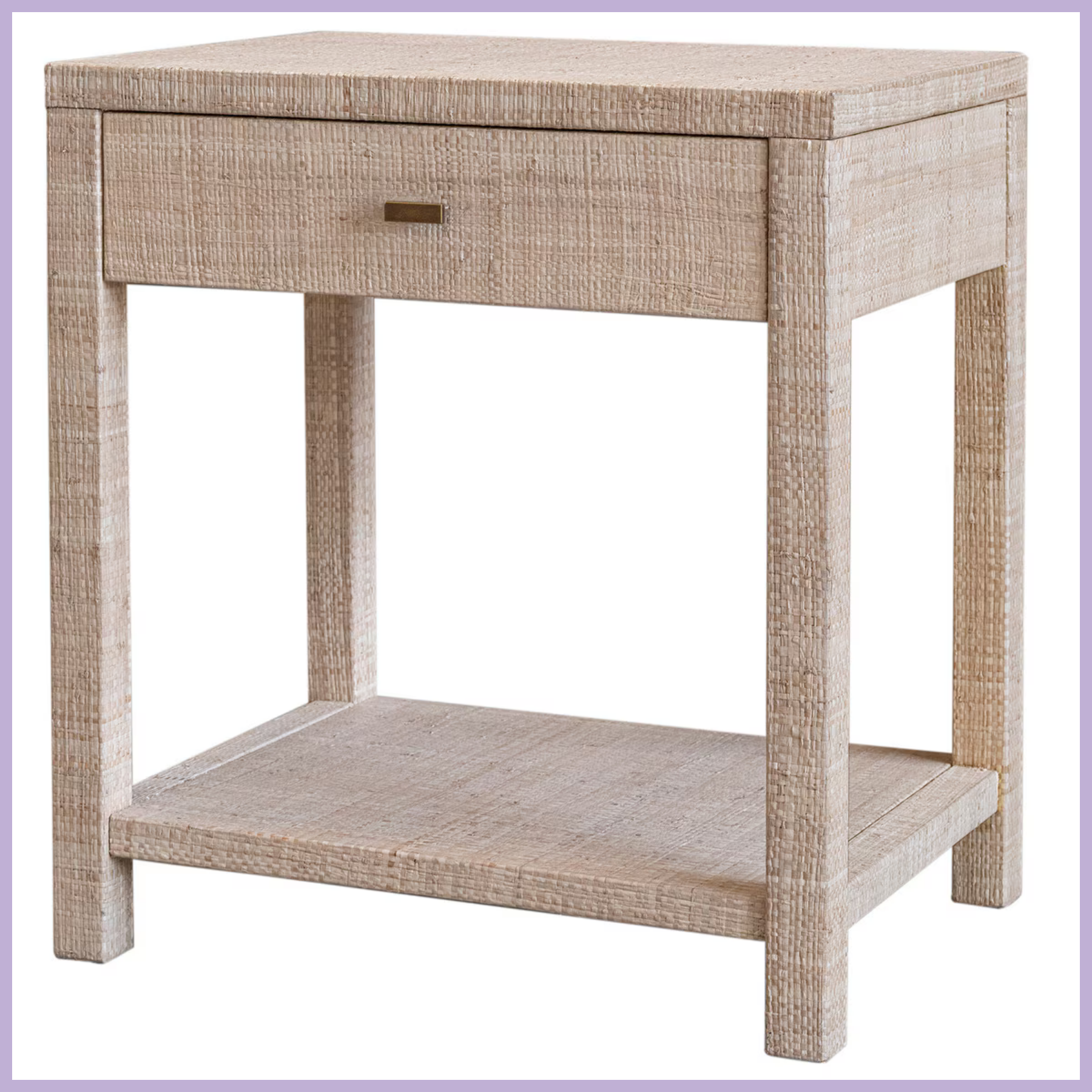 Wrapped in natural raffia, hand finished in timeless natural color, this tailored nightstand has elevated coastal charm and modern functionality. Handcrafted from solid Bayur wood, the bedside table includes a single drawer for concealed storage, accented by metal drawer pulls with an antique brass patina. The open shelf provides an ideal showcase for your favorite home accents, while the woven artisan texture and organic design add a touch of relaxed sophistication to any bedroom. This nightstand offers both sytle and storage and seamlessly bridges traditional, transitional, and contemporary styles.