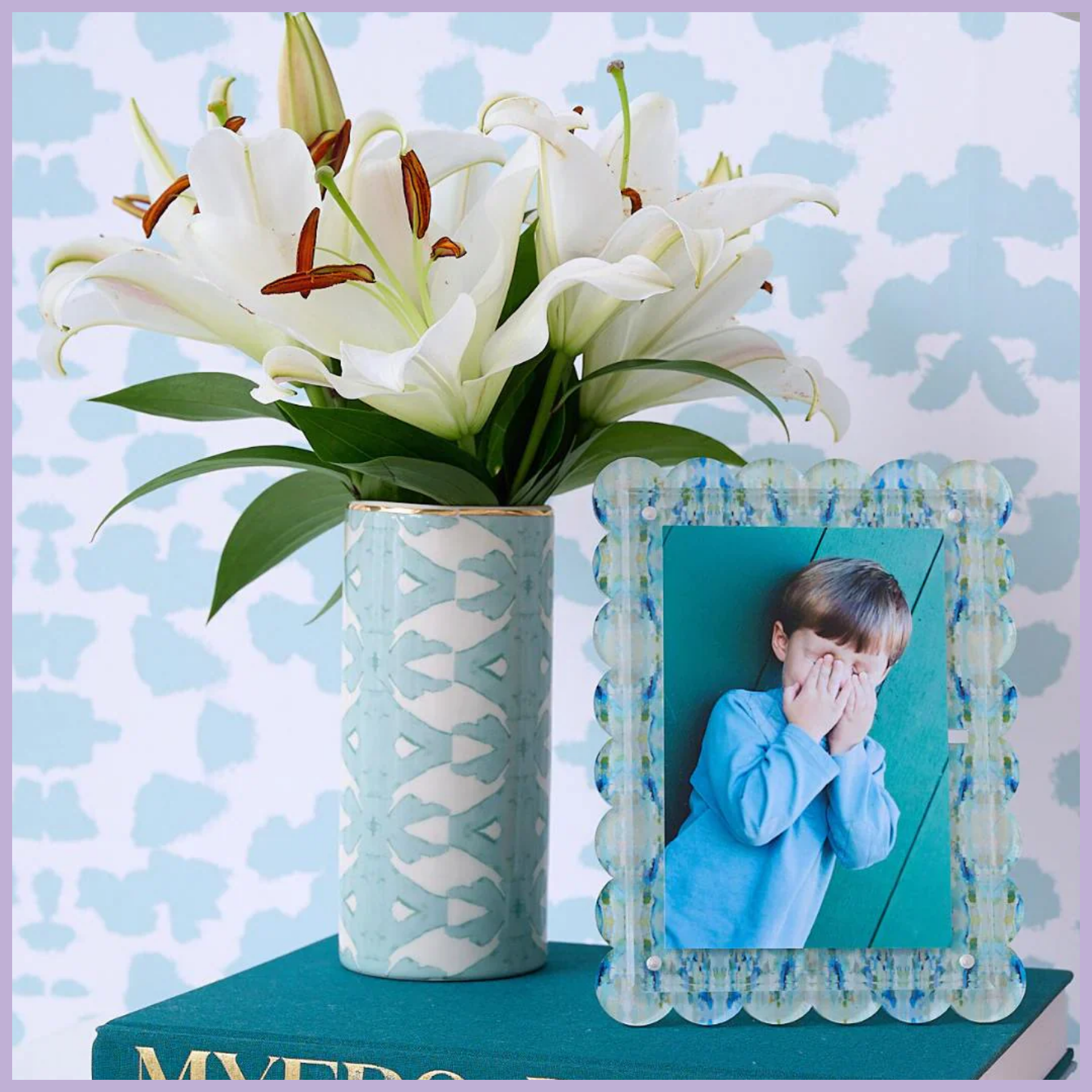 Brighten your space with our Palm Mist Vase, featuring Laura Park’s signature abstract print in cheerful shades of blue. This ceramic cylinder vase is finished with a delicate gold rim, perfect for fresh blooms, stems, or as a colorful accent all on its own.
