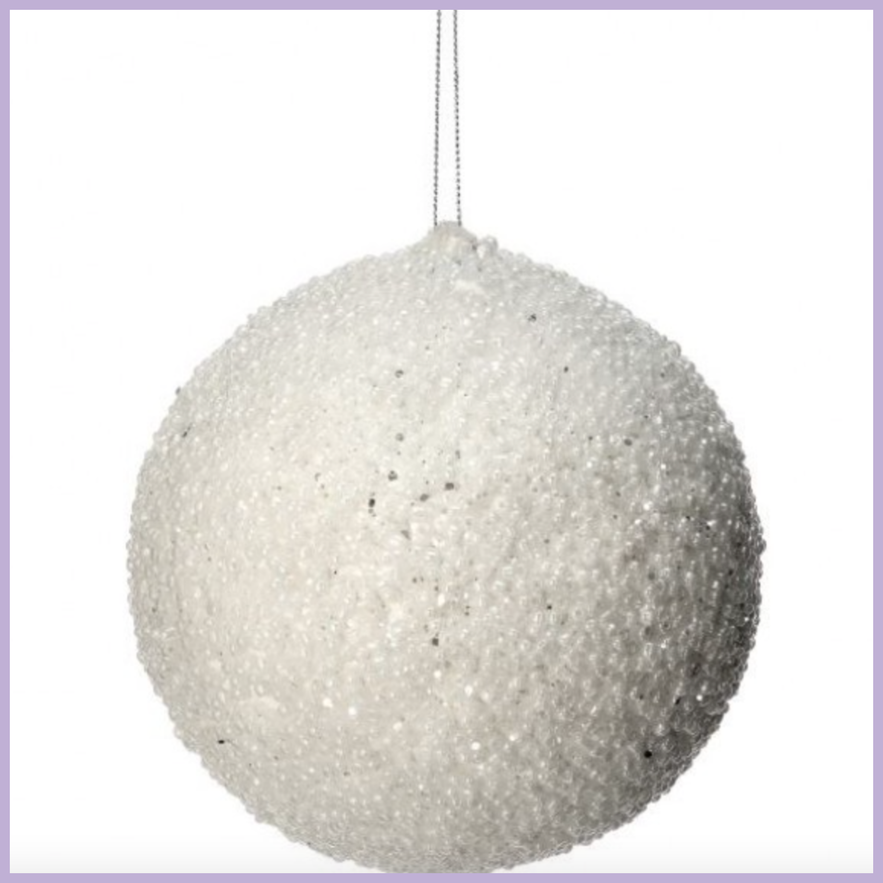 Elegant glass ornament featuring a pearlized finish and subtle glitter accents. Adds a touch of sophistication and sparkle to any holiday décor.
