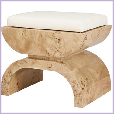 This lavish, Asian-inspired stool delights with its graceful curves and sculptural form. The exotic, natural beauty of rich burl wood gives each piece a warmth and personality all its own, and the structured white linen seat offers the perfect perch. Bunch two beneath our Marshall console for a dramatic entryway, then introduce as extra seating when you’re playing host.