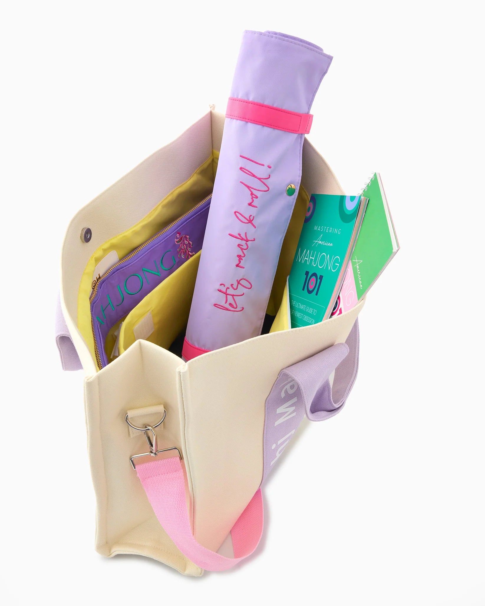 Meet your new favorite companion for Mahjong and beyond! This refreshed canvas storage bag is designed to bring a smile to your face while elevating your gaming experience. The Lilac Mahj It All Bag isn’t just for Mahjong; it effortlessly transforms into a stylish work bag too.