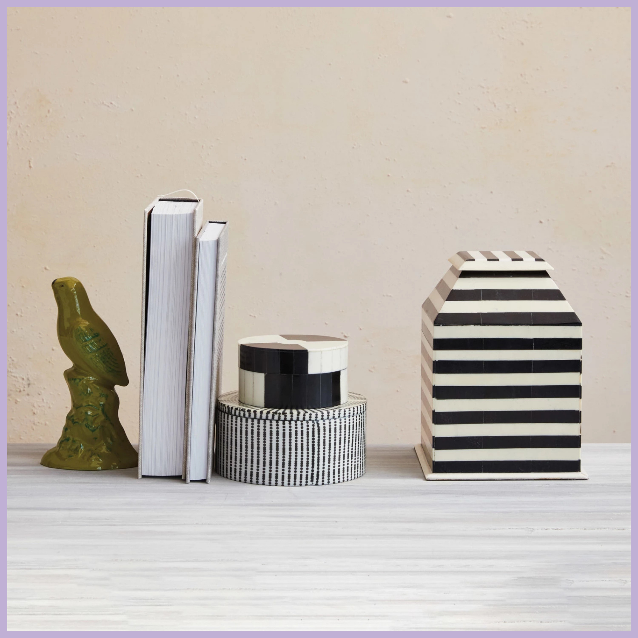 This resin and reclaimed wood box, black and white is a stylish and practical piece for any home. It consists of a round base and a lid that feature a resin and reclaimed wood construction and a black and white color. The resin and reclaimed wood construction is durable and smooth, which makes this box last for a long time. The black and white color creates a chic and contrasted effect that makes this box stand out. It is perfect for storing and displaying jewelry, accessories, trinkets, or other small items in the bedroom, bathroom, or living room. It can also be used as a decorative accent on a shelf, table, or mantel. This box is easy to clean and maintain, and it will enhance any space with its beauty and style. It measures 6.25 inches in diameter and 3 inches in height, making it suitable for any space. This resin and reclaimed wood box, black and white is a must-have for anyone who loves style and functionality.