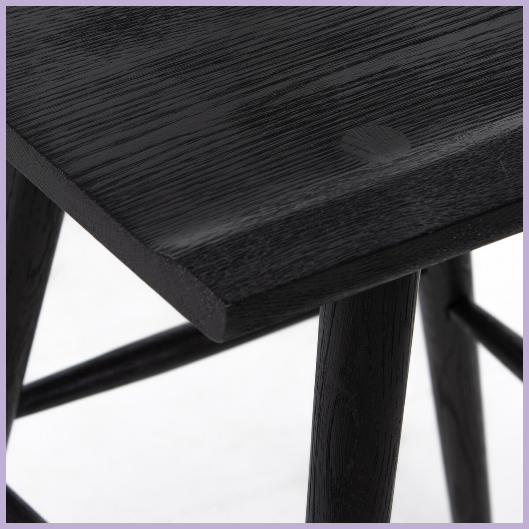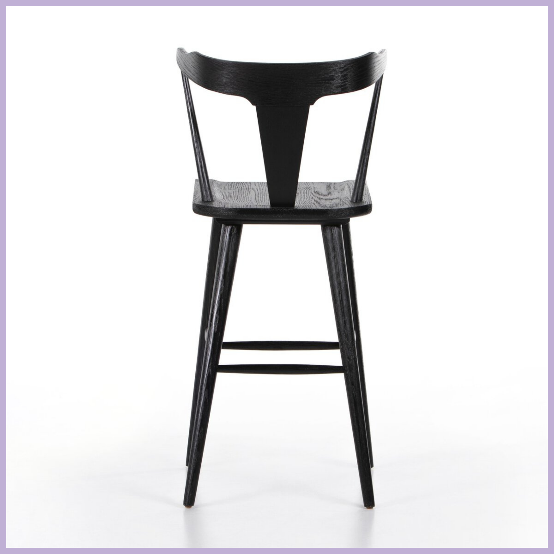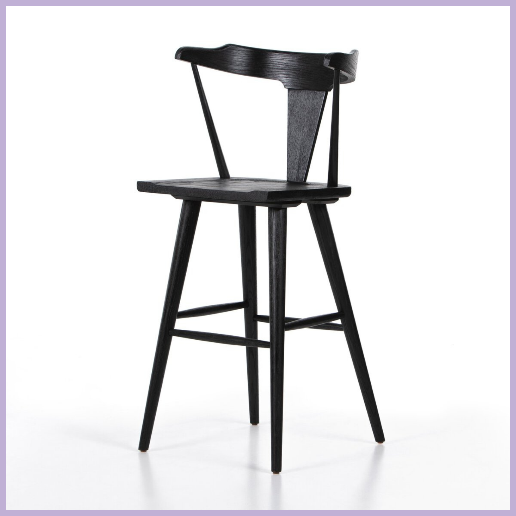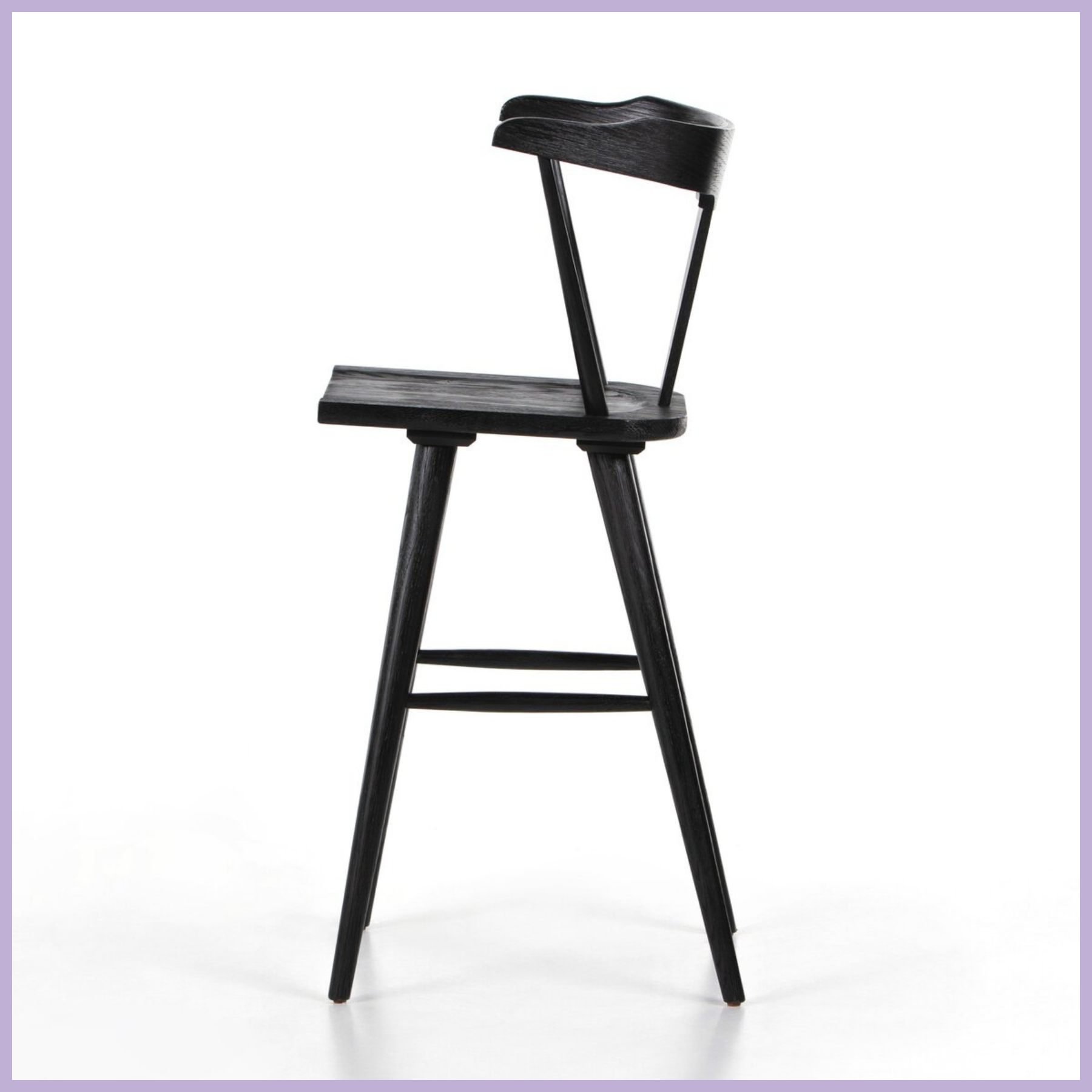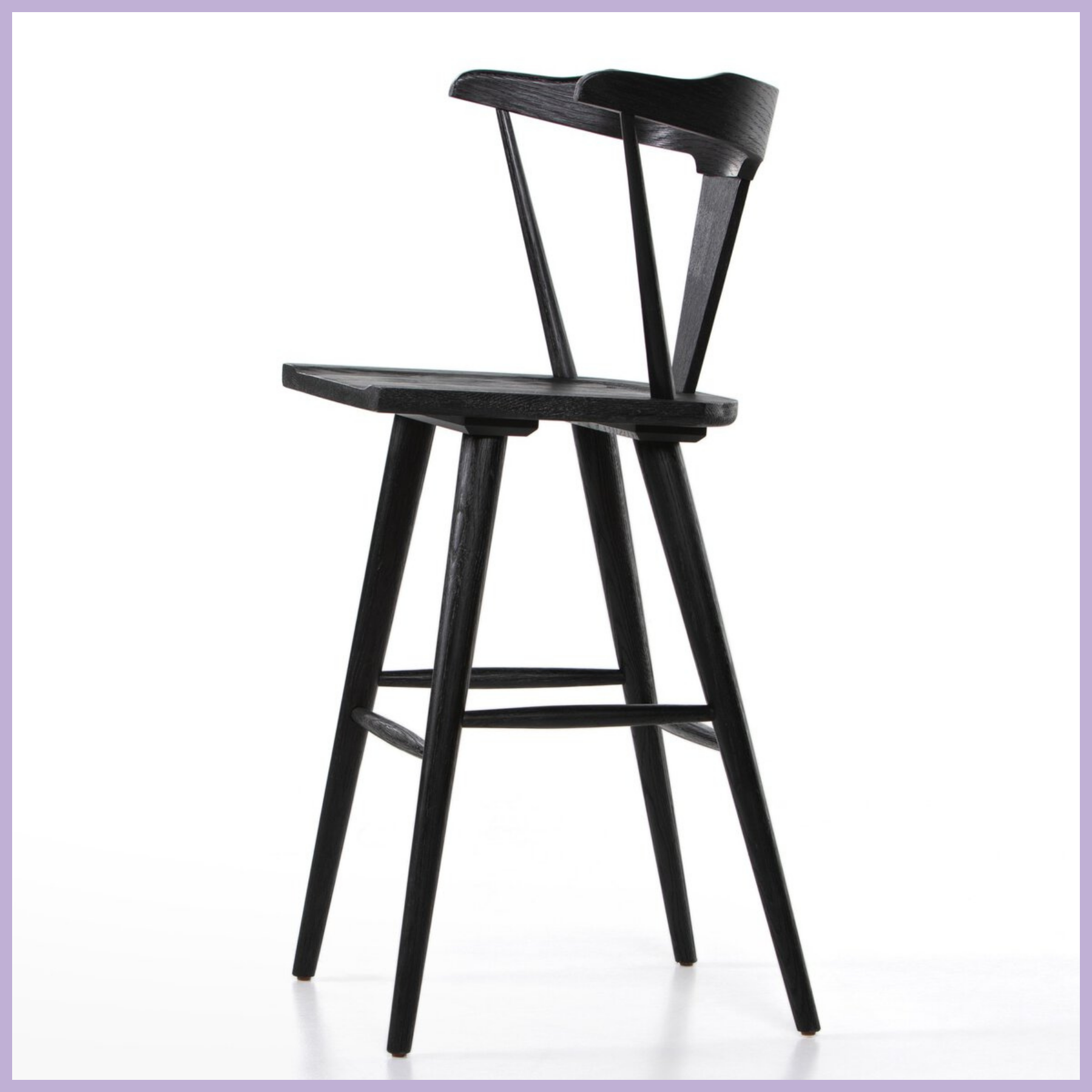 A fresh, bar-style take on mid-century Windsor seating, featuring a bowed, sculptural silhouette and soft black finish to highlight the natural grain of weathered oak.
