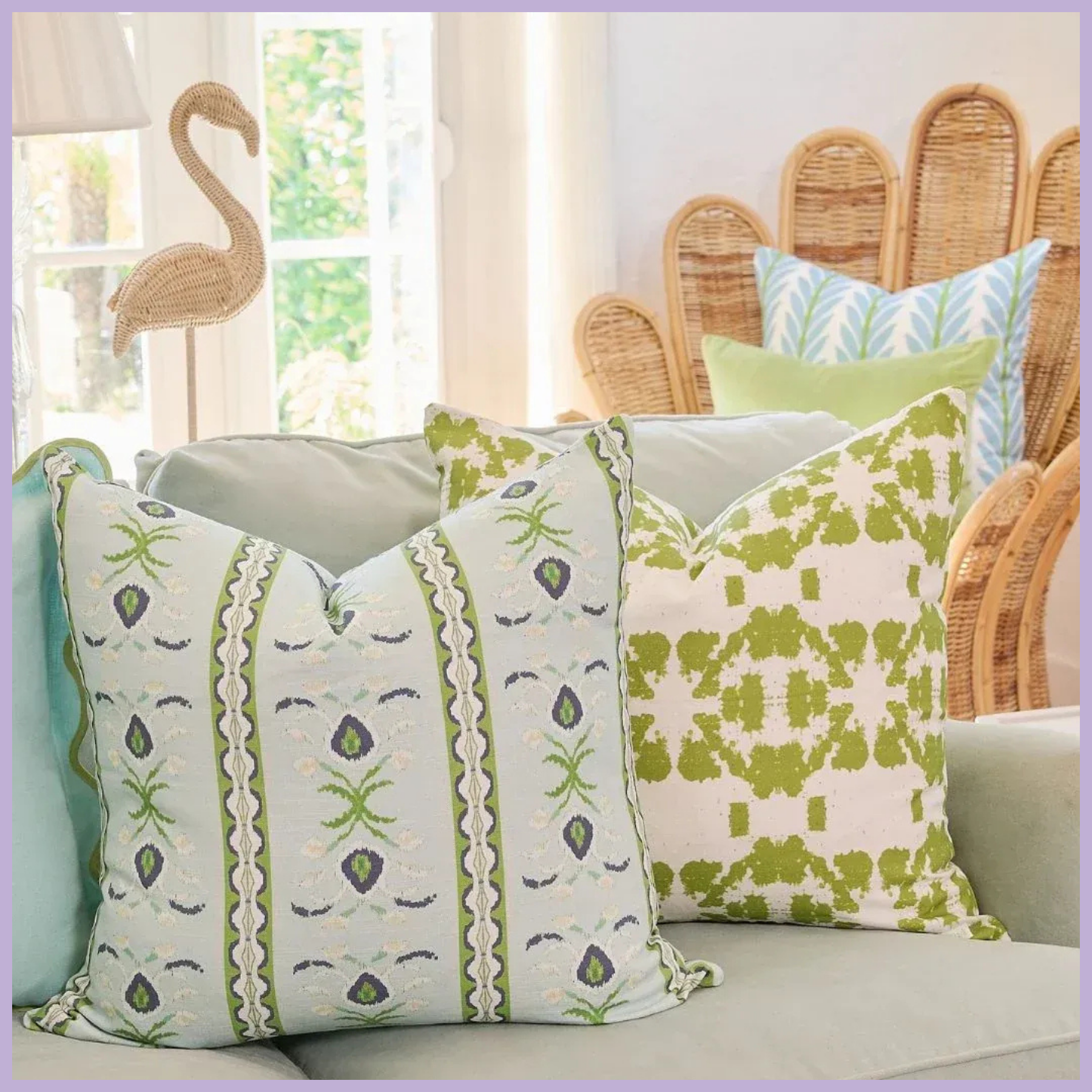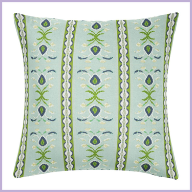 Soft, structured, and quietly playful. Delicate floral motifs and vertical striping in fresh lagoon blues and layered green tones create a balanced, tailored look. An easy layering piece for sofas, beds, and accent chairs that adds pattern without overwhelming the space.