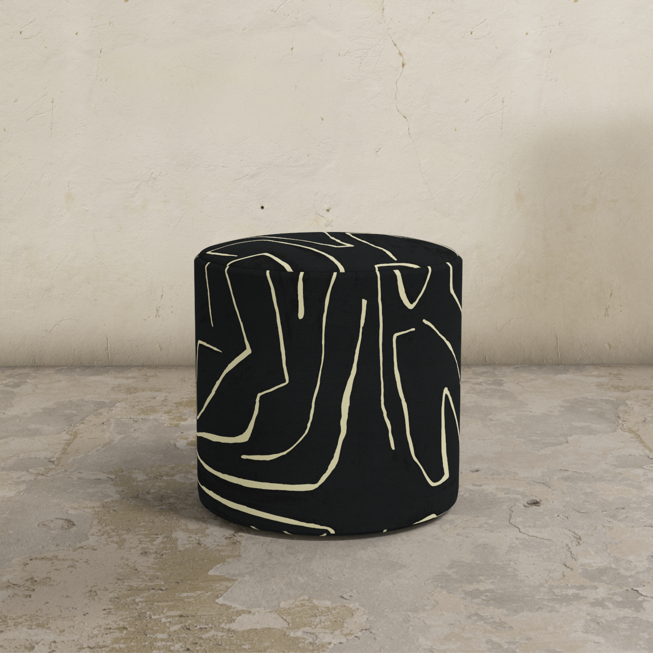 This versatile round ottoman is crafted with a round pine frame and boldly patterned upholstery filled with fibers and foam. Made in the USA. More colors available upon request.