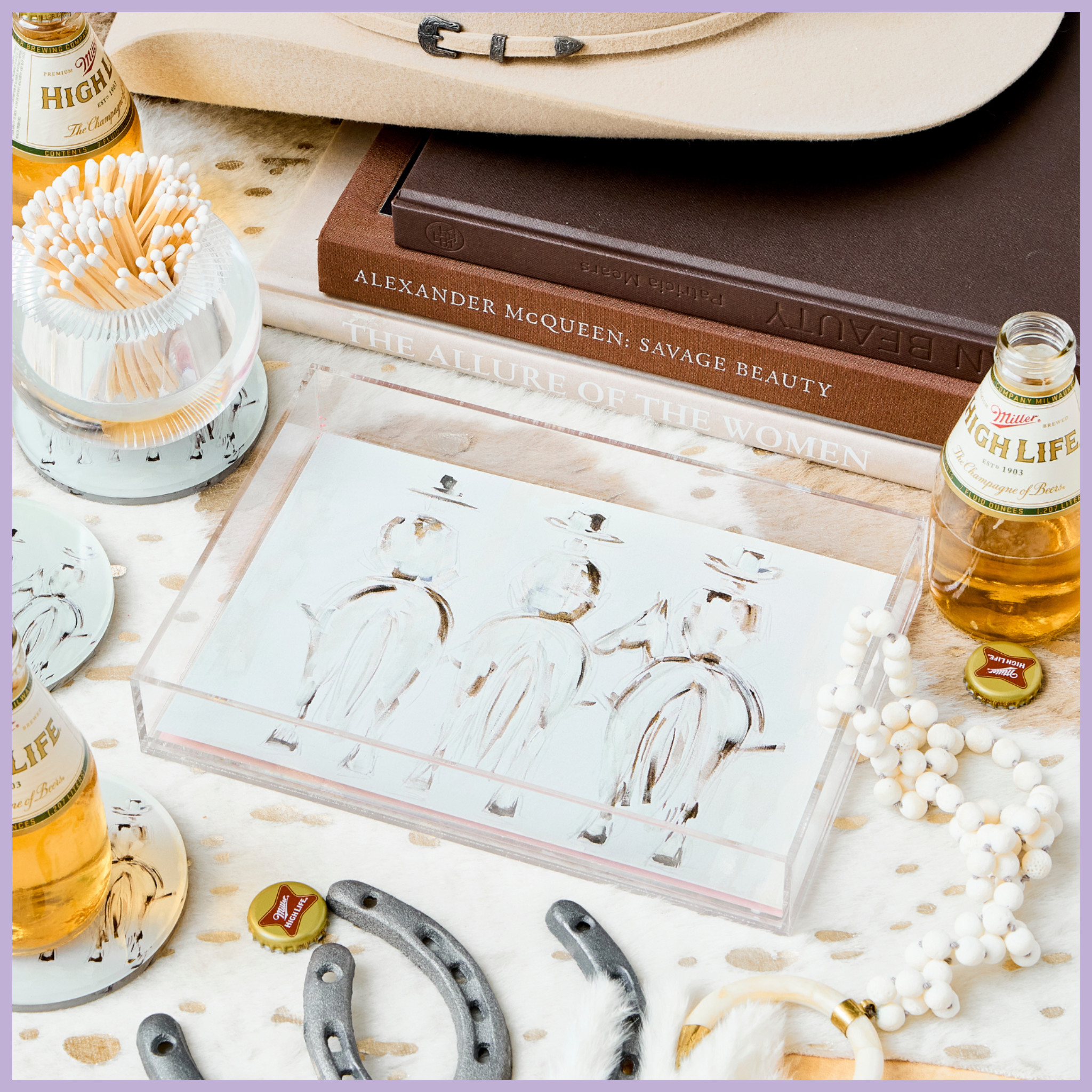 Get ready to serve up some fun with our Three Amigos Small Tray! This durable acrylic serving tray features a playful design of three cowboys, tres amigos, hand-painted by Emma Katherine. Perfect for entertaining guests or adding a touch of spice to your own space. Bring the amigos and lets party!